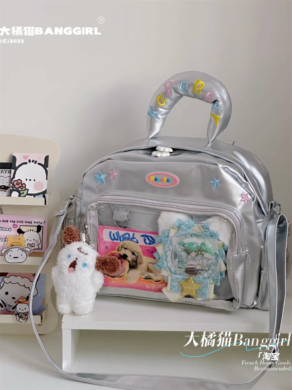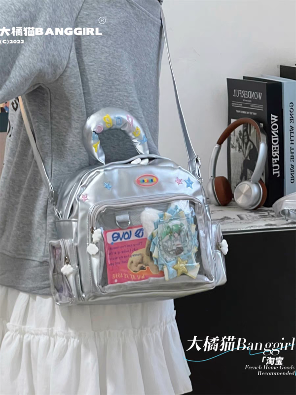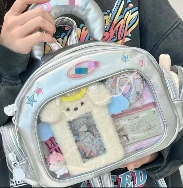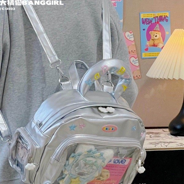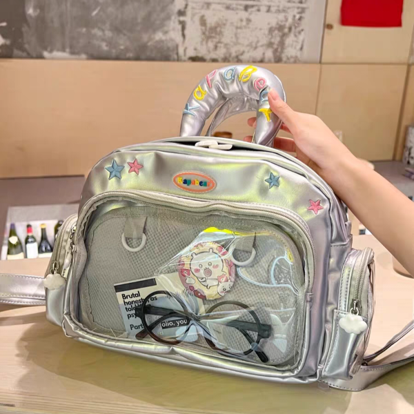 28 x 21 x 11 cm. Mochila Itabag Convertible en Cartera o Morral. Con varios compartimentos transparentes para decorar con tus trinkets, peluche, ternurines o lo que quieras.